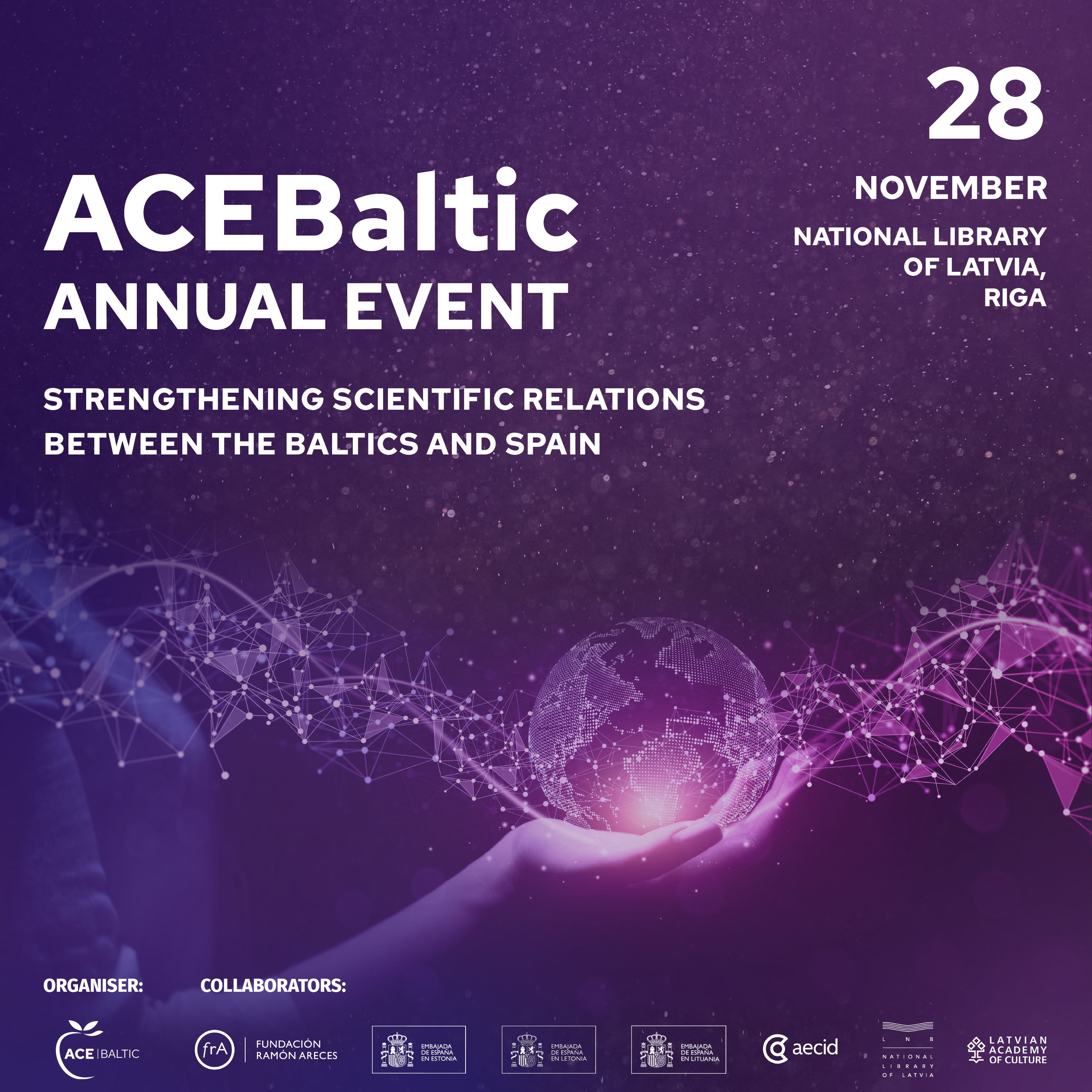 ACEBaltic Annual Event 2025 will take place on 28 November in Riga. It is conceived as a platform for science diplomacy, which brings together high-level institutional representatives, leading researchers, and key stakeholders from Spain and the three Baltic countries, fostering dialogue and strengthening scientific cooperation.